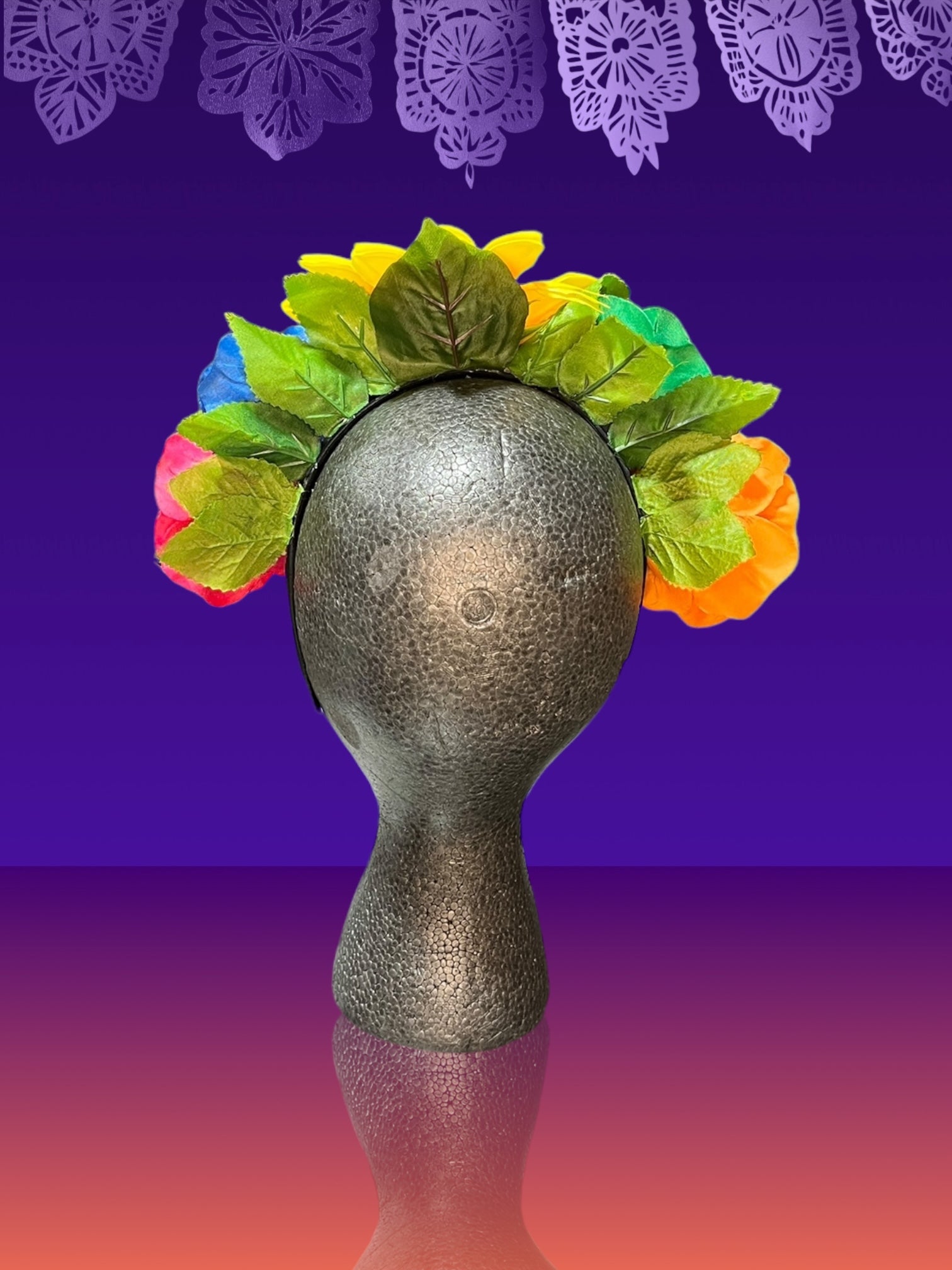 This headband has 4 artificial assorted color roses and a vibrant sunflower in the center, all on a satin-wrapped plastic headband. It's perfect for any occasion, whether it's a wedding, festival, or even Día de Muertos (Day of the Dead). Suitable for ages 10 and up!